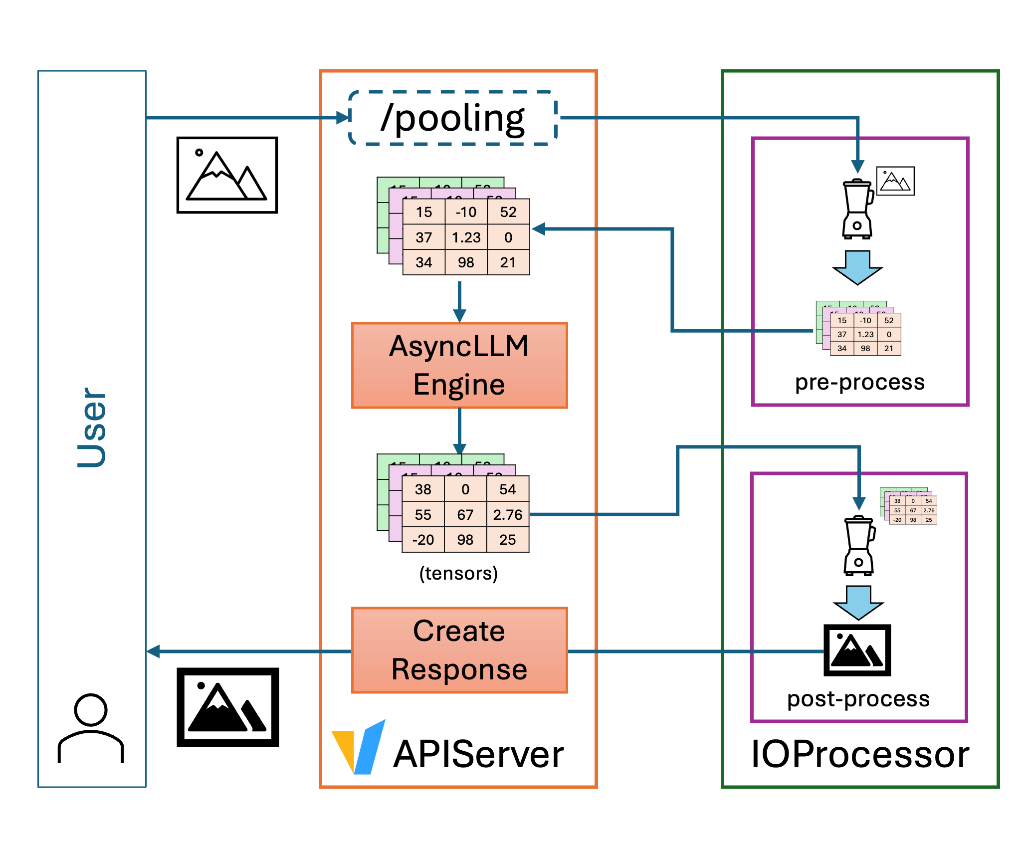 这就是我们引入的新 IO Processor 插件框架发挥作用的地方。IO Processor 框架允许开发者在同一个 vLLM 服务实例中自定义模型的输入和输出如何进行预处理和后处理。无论你的模型返回的是字符串、JSON 对象、图像张量还是自定义数据结构,IO Processor 都能在返回给客户端之前将其转换为所需的格式。