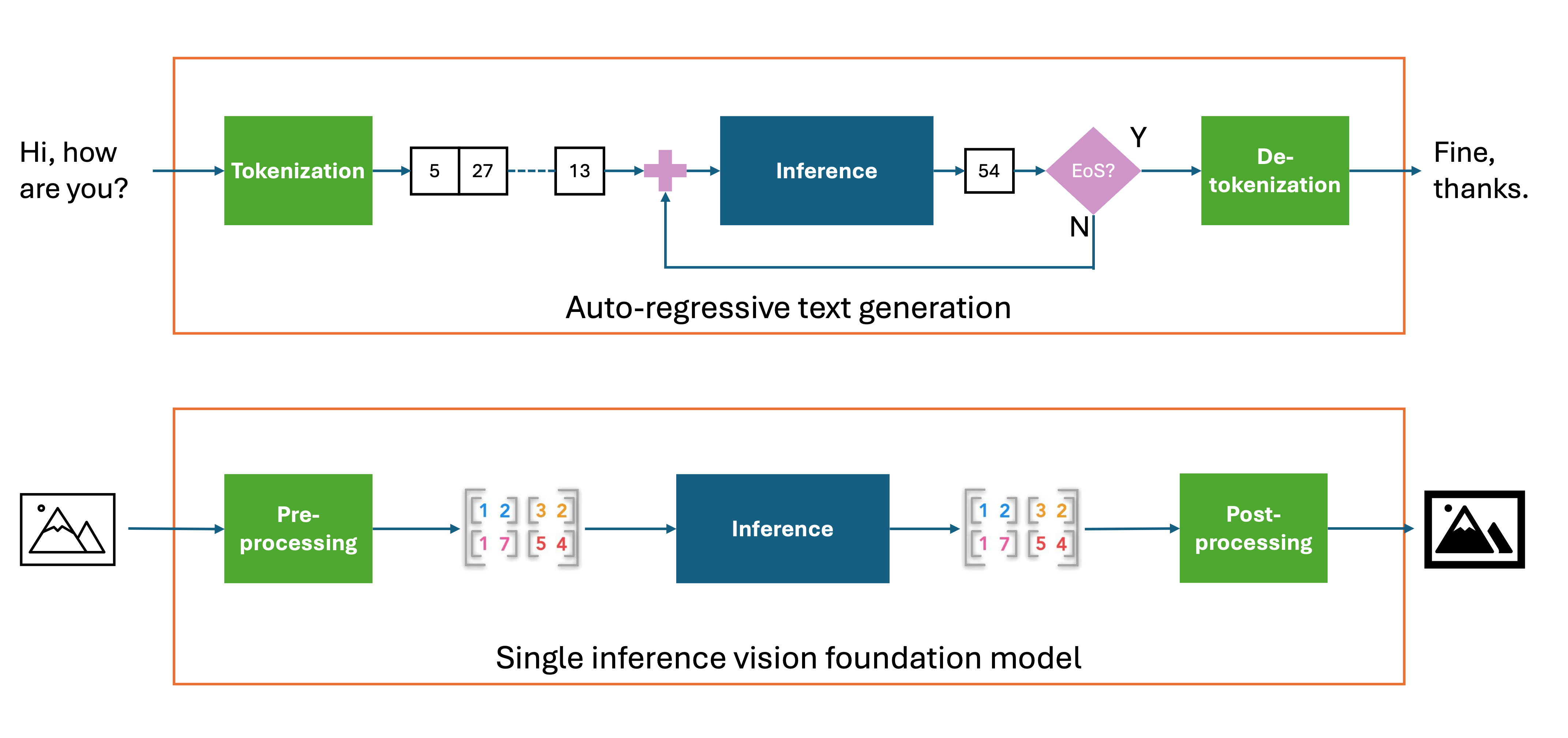与文本模型不同,地理空间基础模型(通常实现为视觉 Transformer)不需要令牌解码,也就是说,它们不需要将输出令牌转换为文本。相反,给定一张输入图像,单次推理会生成原始模型输出,然后经过后处理形成输出图像。此外,有时输入图像需要被分割并批处理成若干个子图像,即图块(patches)。这些图块随后被送入模型进行推理,每个图块产生的输出图像再被拼接在一起,形成最终的输出图像。