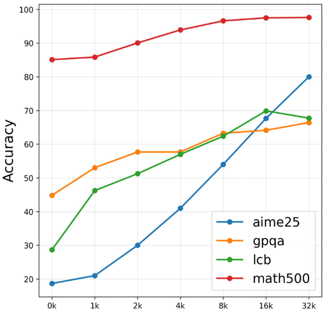 图 2:图表显示 Nemotron Nano 2 9B 模型在不同“Token 预算”阈值下于流行基准测试中的准确性