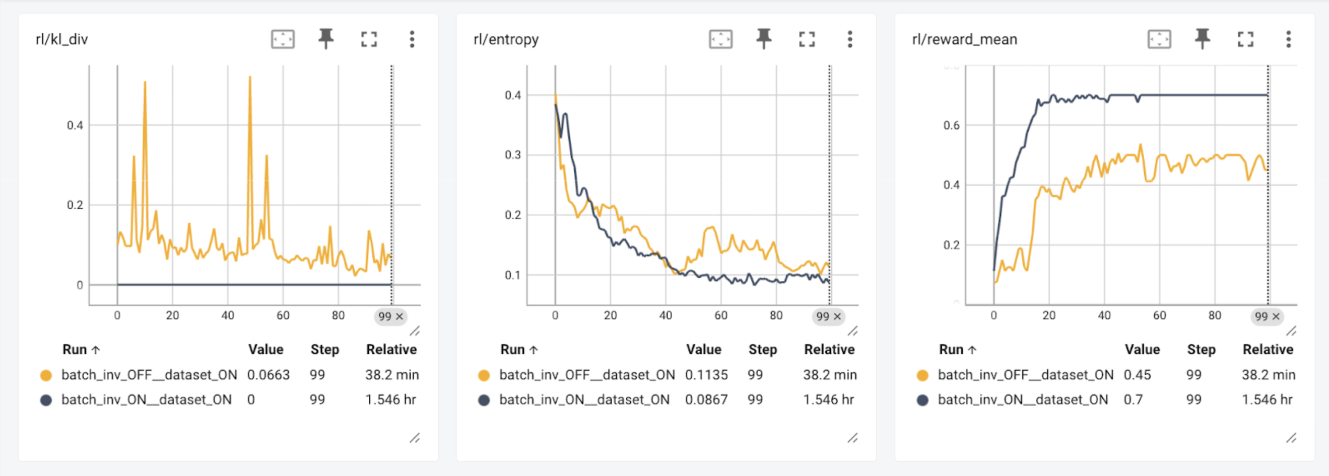 研究表明,强化学习会放大训练器和采样器之间微小的数值差异,导致不确定和不稳定的训练行为(He et al., Yao, Liu et al. & Liu, Li et al.)。我们的实验结果验证了数值计算对强化学习结果的影响:当采样器使用与训练器不同的核函数时(batch_inv_OFF),在 100 个步骤后奖励值降低。启用比特级精确训练后(batch_inv_ON,此时 kl_div 始终为 0.0),我们观察到模型不仅训练步数减少,而且达到了更高的总奖励。