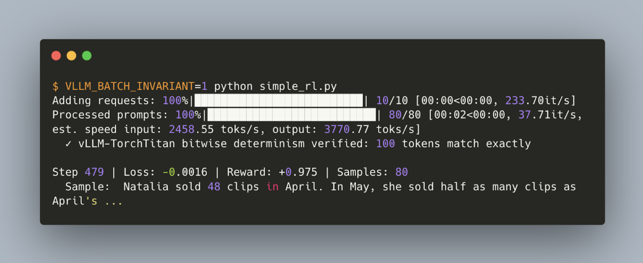 我们展示了一个开源的、比特级一致的同策略(on-policy)强化学习运行流程,其中使用 TorchTitan 作为训练引擎,vLLM 作为推理引擎。基于 vLLM 近期在批处理不变性推理方面的工作,我们在我们开源的指南中展示了如何对 Qwen3 1.7B 进行强化学习微调,并实现训练和推理数值上的比特级匹配。
