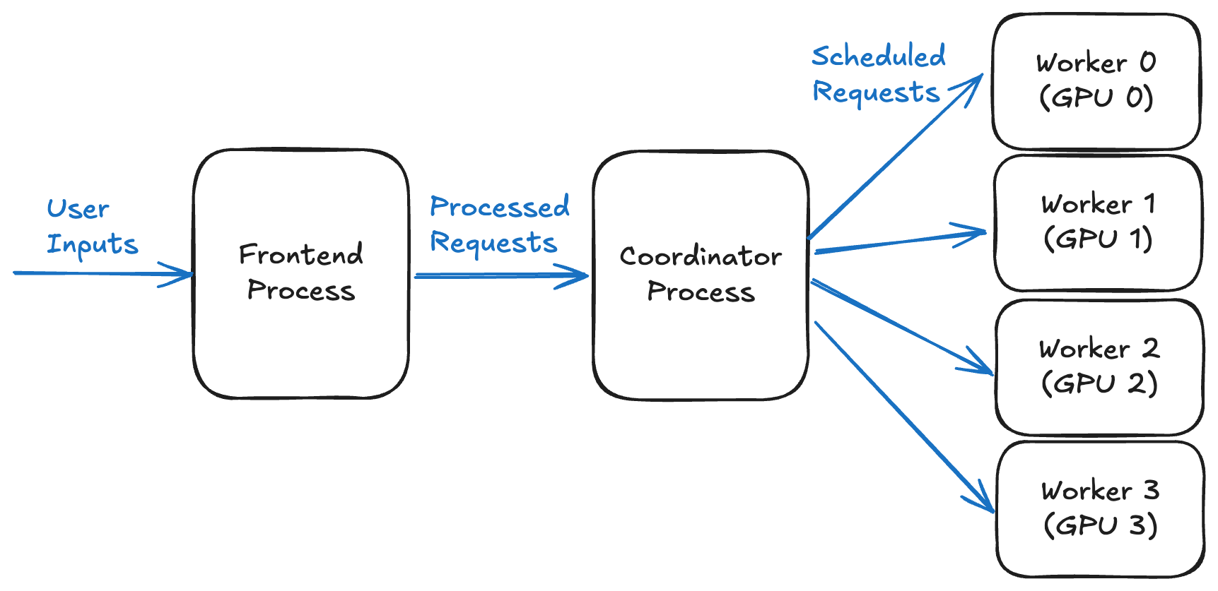 下图展示了在一个使用四块 GPU 的 LLM 推理系统中,各个进程如何协调工作。前端将输入数据发送给协调器,协调器再将其路由到四个工作进程(每个 GPU 一个)以执行推理。