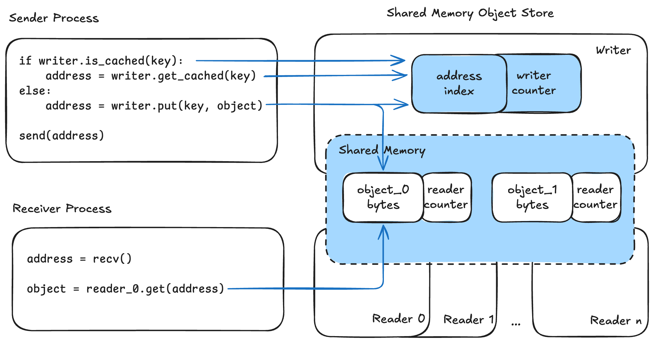 在发送一个键-对象对时,发送方首先通过 is_cached(key) 检查该键是否已缓存。如果已缓存,写入方使用 get_cached(key) 获取缓冲区地址;否则,它将对象用 put(key, object) 存储到共享内存中并获得缓冲区地址。然后,发送方通过默认的 IPC 将此地址广播给所有接收方。