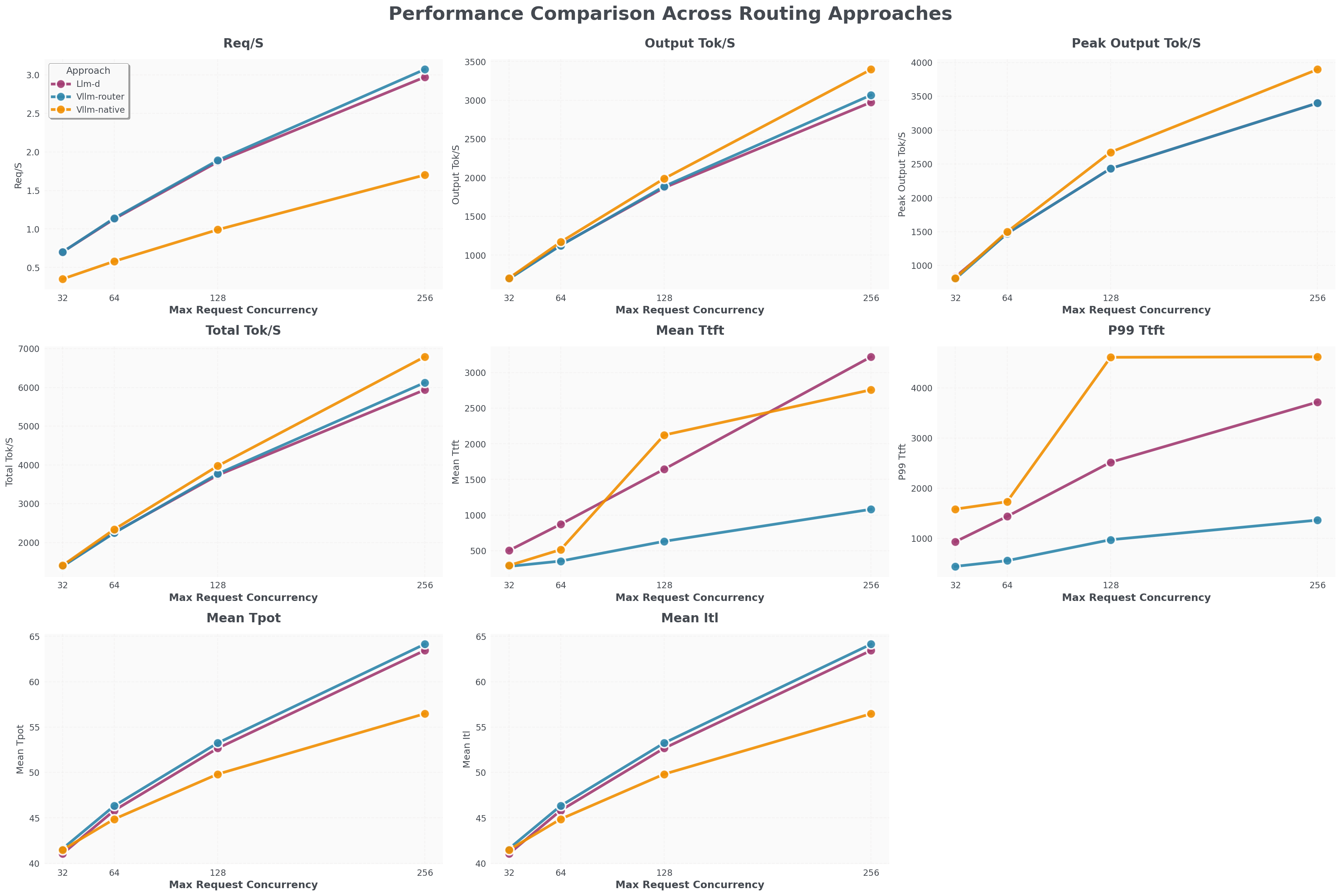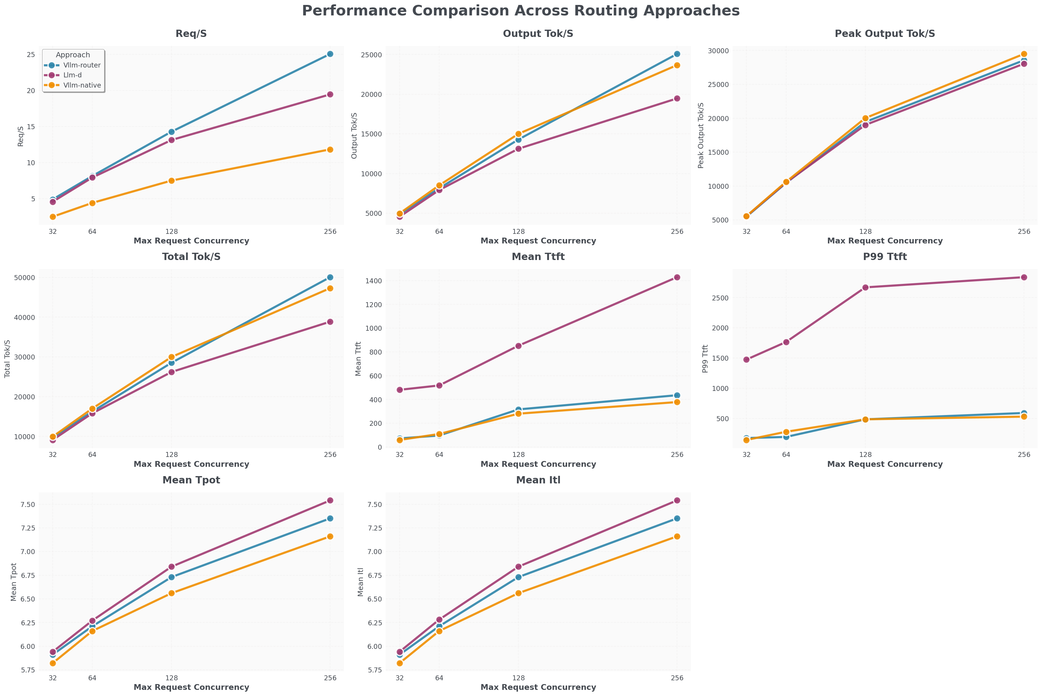 - vLLM Router (蓝色线) 的请求/秒吞吐量与 llm-d (紫色线) 接近,比 K8s 原生负载均衡器 (橙色线) 高 100%。