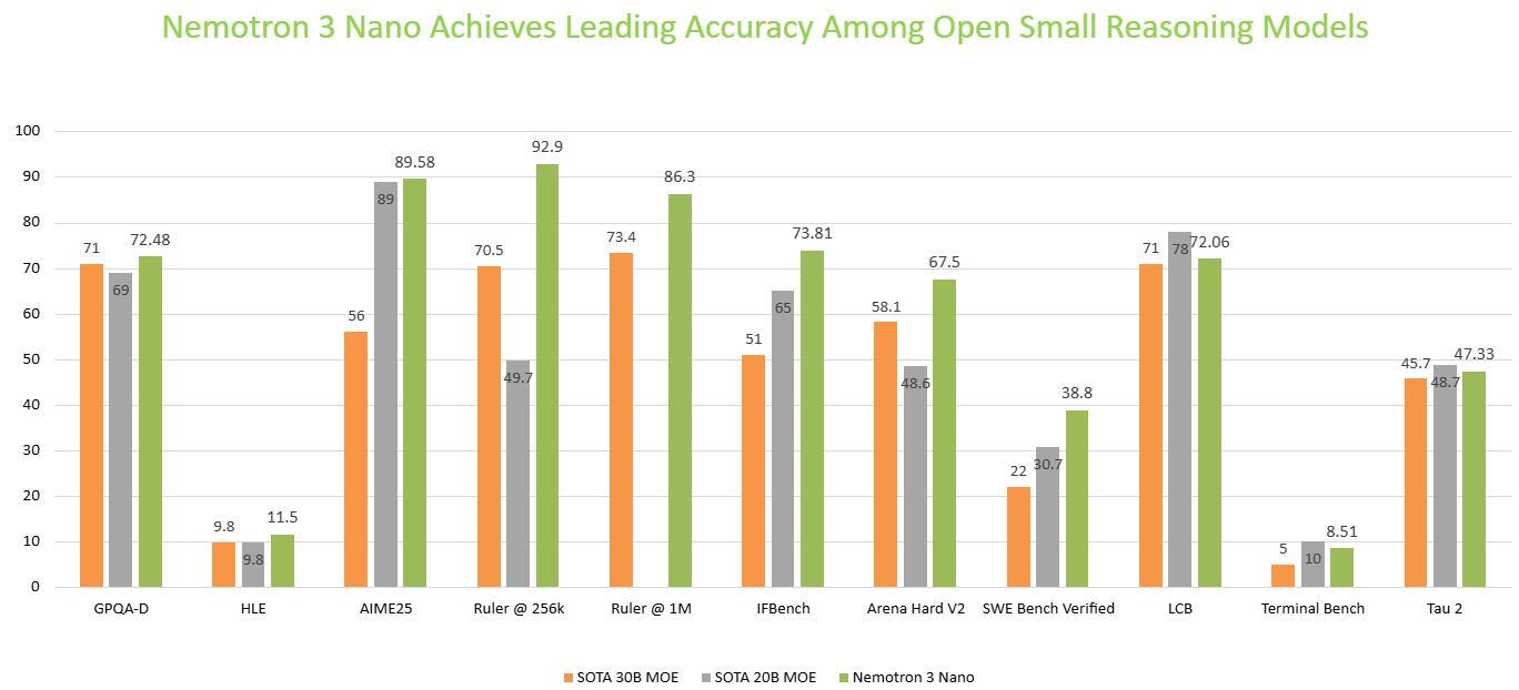 图 3:Nemotron 3 Nano 在开放式小型推理模型中的各种流行学术基准测试中提供了领先的准确性